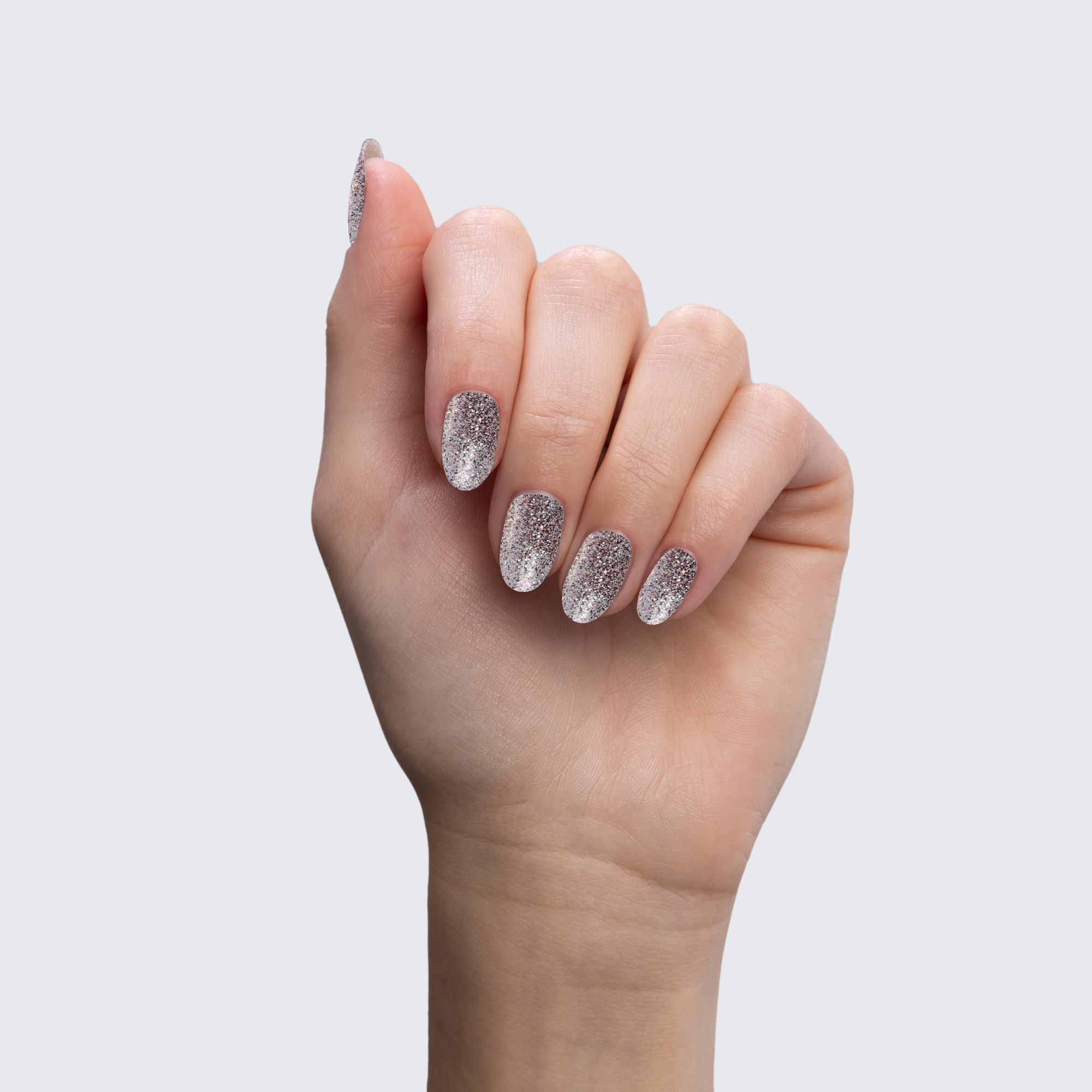 Clear coat with rose gold glitter & silver sparkles. Translucent.